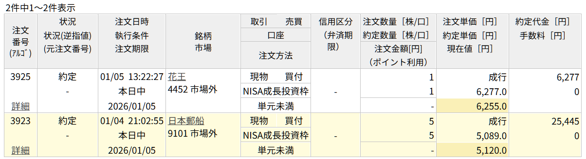本日はさらに、国内唯一の「30年以上連続増配」を誇る花王を1株追加しました。 ディフェンシブ株の代表格である花王をポートフォリオに加えることで、景気敏感な海運株(日本郵船)とのバランスを取り、より強固な守りを固める狙いです。