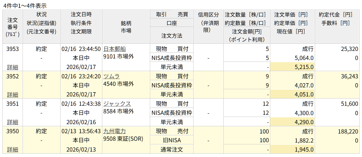 旧NISA口座で保有し、しっかりと含み益が出ていた九州電力(9508)を利益確定し、その原資を使ってジャックス・ツムラ・日本郵船の3銘柄を買い増ししました!
