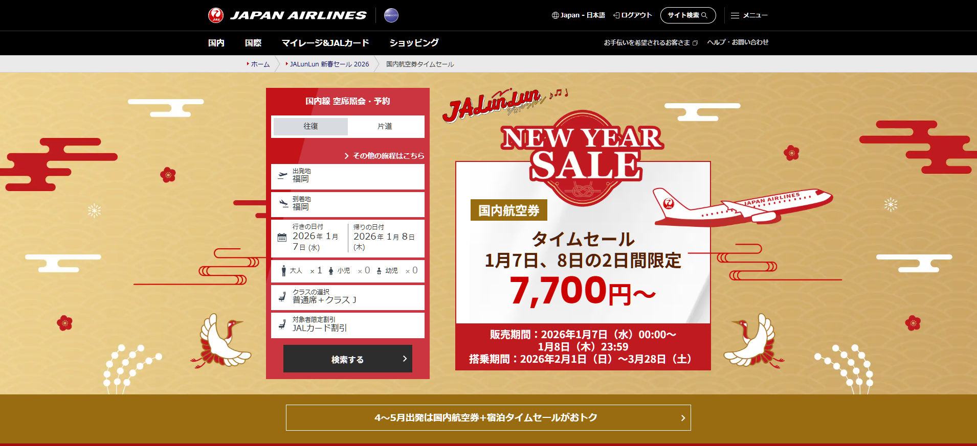 JALは2日間限定と非常にタイトですが、2月・3月の旅行が片道7,700円からと非常に魅力的です。