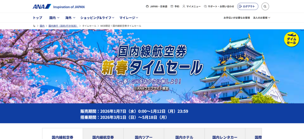 JALとANAの国内線新春タイムセールです!