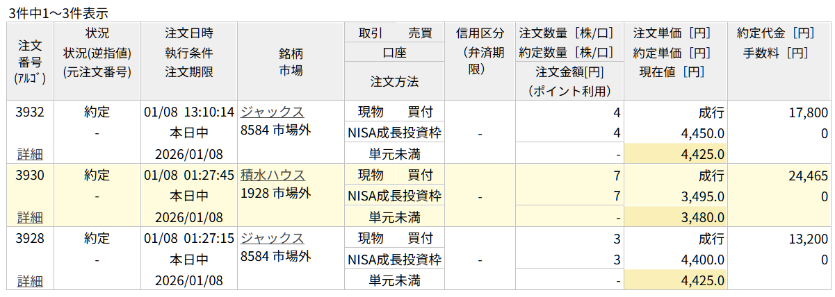 どちらも高配当株として知られる、僕のポートフォリオの主力候補たちです。 特にジャックスは、一度にまとめて買うのではなく、株価の動きを見ながら数回に分けてポチポチと積み上げています。