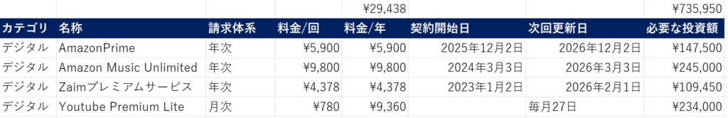 今の僕のサブスク合計は、年間で約2.9万円。これを配当で賄うには約73.5万円の投資が必要です。