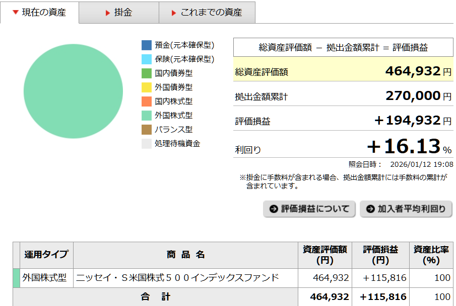 方針を変えてからは、ちょうど株高の流れにも乗って右肩上がりで成長し、今では評価損益 +194,932円(2026年1月12日現在)。