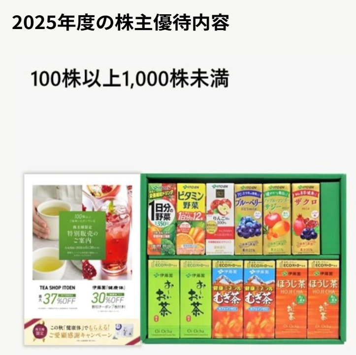 100株保有していれば、毎年1回、お〜いお茶などの「伊藤園製品の詰め合わせセット(1,500円相当)」が届きます。
