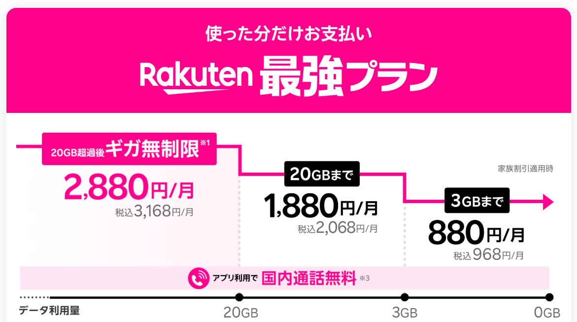 楽天モバイルの料金体系は、3GB超〜20GBまで一律 2,178円 です。